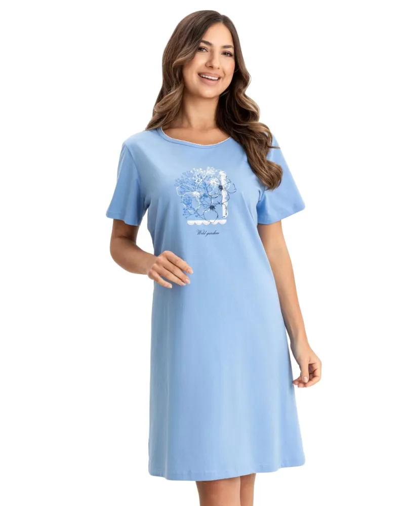Dámská noční košile 174/62 značky REGINA je ztělesněním pohodlí a elegance pro Váš večerní odpočinek. Světlý modrý odstín působí klidně, zatímco volný střih nad kolena poskytuje maximální svobodu pohybu i během spánku. Krátké rukávy a jemný kulatý výstřih vytvářejí příjemné prostředí pro domácí relaxaci. Přední část zdobí decentní květinový motiv, který navozuje pocit útulnosti a pohody.