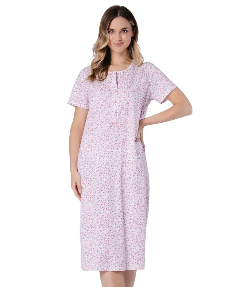 Dámská noční košile Oriana 1723 značky LEVEZA přináší do Vašeho domova pocit lehkosti a pohodlí, který si zamilujete při každém večeru. Její volný střih s délkou ke kolenům umožňuje volnost pohybu a příjemné spaní i odpočinek během dne. Měkký materiál ze 100% bavlny je jemný k pokožce, skvěle dýchá a poskytuje komfort v teplejších měsících. Jemně růžový základ zdobí decentní květinový vzor, který působí elegantně a žensky.