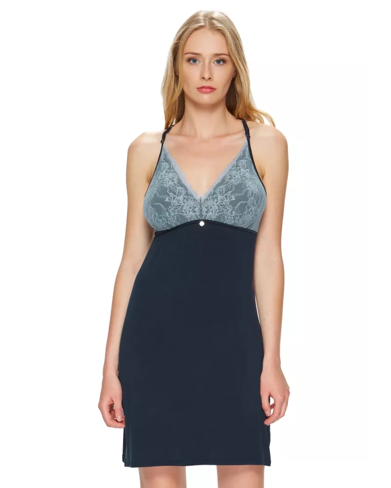 Dámská noční košile na úzká ramínka se širokou květinovou krajkou.