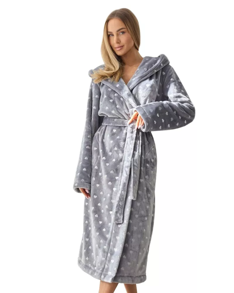 Dámský župan Amira long grey značky L&L představuje dokonalou kombinaci elegance a pohodlí, kterou si zamilujete při každodenním odpočinku. Tento dlouhý župan s kapucí je vyroben z mimořádně hebkého materiálu Wellsoft, jenž pohladí Vaši pokožku a poskytne pocit lehkosti i během chladnějších dnů. Jemný šedý odstín doplňuje decentní vzor srdcí, který působí hravě a zároveň vkusně. Praktické zavazování v pase umožňuje snadné přizpůsobení postavy pro maximální komfort po koupeli nebo při večerním relaxu.