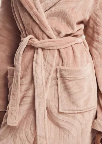 Župan je vyrobený z prémiového materiálu Wellsoft – 100% polyester, který Vás zahalí do měkkosti a zajistí dokonalé teplo po koupeli nebo během večerní relaxace. Zavazování v pase umožňuje individuální nastavení podle Vašich potřeb, zatímco dvě prostorné kapsy poskytují místo pro drobnosti či zahřátí rukou.