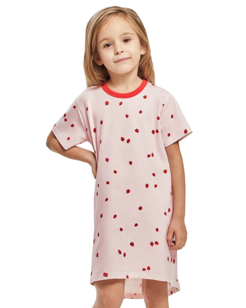 Dívčí noční košile Maia 3546 značky TARO přináší do každodenního večerního rituálu pocit lehkosti a pohodlí. Jemně růžový základ s jemným vzorem malých červených jahod působí svěže a hravě, což ocení každá mladá slečna. Volný střih s krátkým rukávem umožňuje volnost pohybu i během spánku, zatímco kulatý výstřih podtrhuje jednoduchou eleganci tohoto modelu.