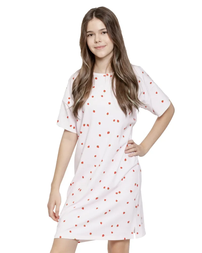 Dívčí noční košile Maia 3589 značky TARO přináší do každodenního večerního rituálu pocit lehkosti a pohodlí. Bílý základ s jemným vzorem malých červených jahod působí svěže a hravě, což ocení každá mladá slečna. Volný střih s krátkým rukávem umožňuje volnost pohybu i během spánku, zatímco kulatý výstřih podtrhuje jednoduchou eleganci tohoto modelu.