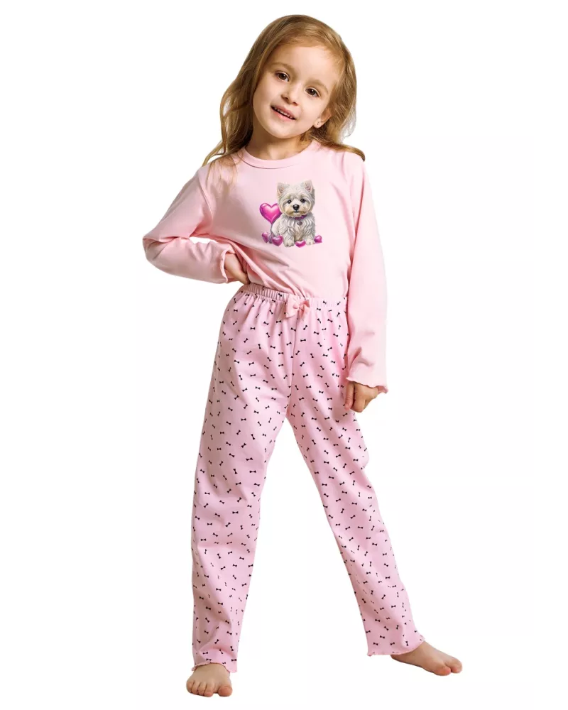 Dívčí pyžamo Clara 3488/3489 značky TARO přináší do dětského šatníku kombinaci pohodlí a hravé elegance. Vrchní díl s dlouhými rukávy v jemné růžové barvě zdobí roztomilý obrázek pejska s motivem srdce, který potěší každou malou slečnu. Spodní kalhoty ladí se vzorem drobných tmavých tvarů a pružným pasem, což zajišťuje maximální volnost pohybu během spánku i odpočinku doma. Materiál ze 100% bavlny je příjemný na dotek, prodyšný a vhodný pro citlivou dětskou pokožku – díky tomu se Vaše dítě bude cítit uvolněně po celou noc.