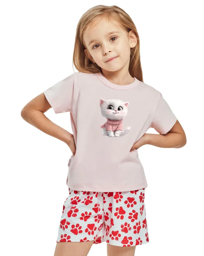 Dívčí pyžamo Nala 3550/3551 značky TARO přináší radost a pohodlí do každého večera. Horní díl tvoří jemné růžové tričko s krátkým rukávem, které zdobí rozkošný obrázek kočičky v růžovém svetru – detail, který si malé milovnice zvířat okamžitě zamilují. Spodní díl představují lehké šortky s elastickým pasem pro maximální komfort a volnost pohybu. Veselý potisk červených tlapiček na bílém podkladu vytváří hravý kontrast k jednobarevnému vršku a dodává celku svěží vzhled.