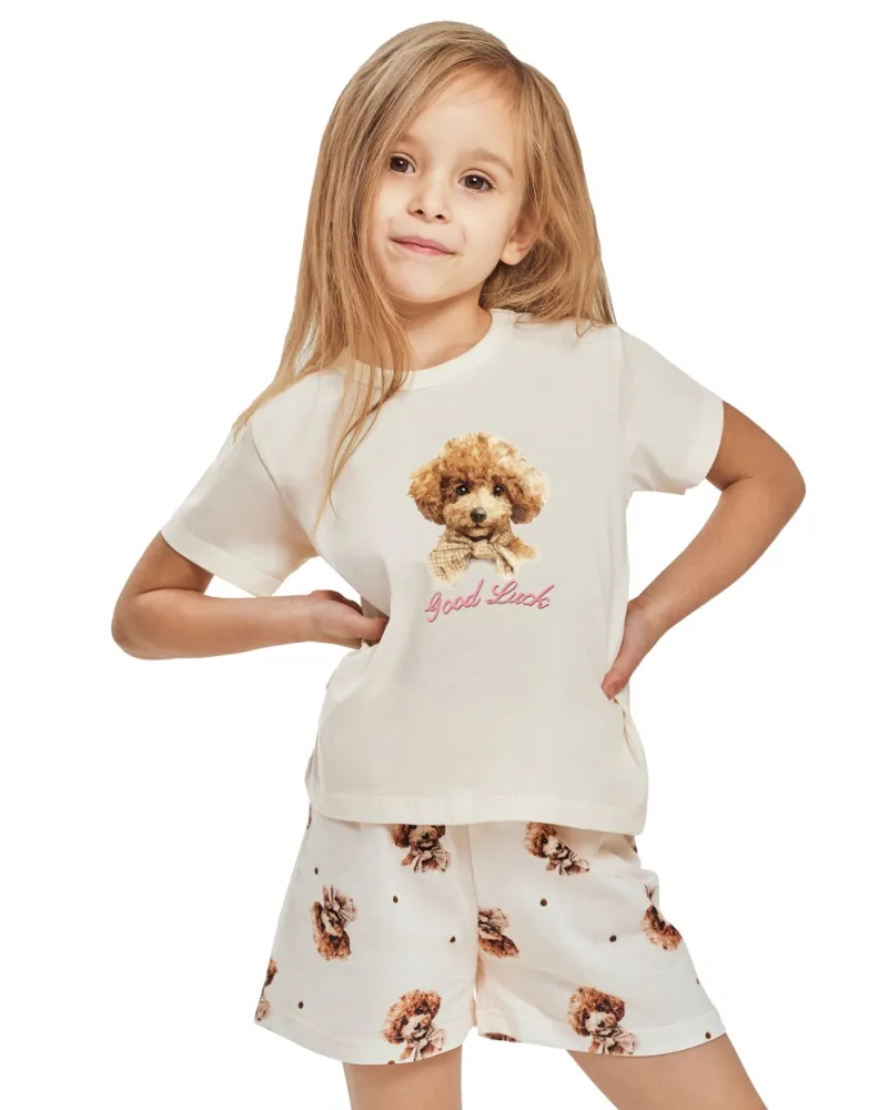 Dívčí pyžamo Coco 3552/3553 značky TARO přináší radost a pohodlí do každého večera. Tento set je navržen s ohledem na maximální komfort i hravý vzhled, který si malé slečny zamilují. Krátké rukávy a volný střih umožňují volnost pohybu, zatímco jemná bavlna příjemně hladí pokožku i během spánku. Horní díl zdobí veselý obrázek pejska s nápisem „Good Luck“, který vykouzlí úsměv před spaním i při ranním probuzení. Spodní díl – krátké kalhoty – ladí díky opakujícím se motivům pejska, což vytváří jednotný a vkusný celek.