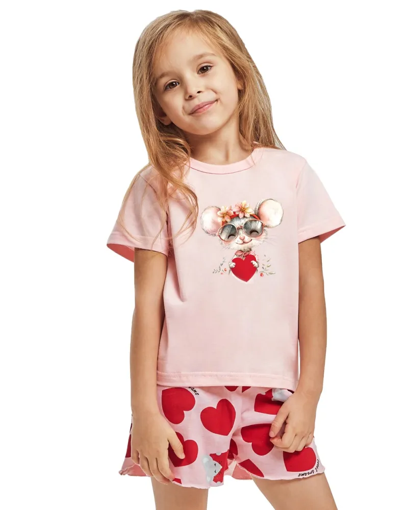 Dívčí pyžamo Mika 3558/3559 značky TARO je ideální volbou pro všechny malé slečny, které si potrpí na pohodlí a styl i během odpočinku. Růžové tričko s roztomilým obrázkem myšky s květinovou korunou a červeným srdcem navozuje hravou atmosféru, zatímco krátké šortky zdobené výraznými červenými srdíčky podtrhují veselý vzhled celého kompletu. Pyžamo je ušité z příjemné, měkké bavlny, která poskytuje maximální komfort při nošení a umožňuje pokožce dýchat po celou noc. Volnější střih trička i šortek spolu se širokým elastickým pasem zajišťují volnost pohybu – perfektní pro klidný spánek nebo domácí lenošení.