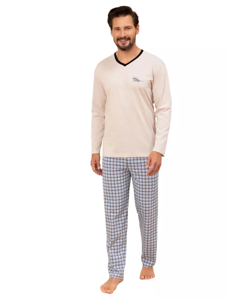 Pánské pyžamo 491/52 značky REGINA přináší do Vašeho večerního rituálu kombinaci nadčasové elegance a pohodlí. Vrchní díl v jemném béžovém odstínu s kontrastním černým lemem u výstřihu véčkového tvaru působí stylově, zatímco decentní obrázek na hrudi dodává osobitý detail. Dlouhé rukávy jsou ideální pro chladnější noci a poskytují příjemný pocit tepla. Spodní část tvoří volné kalhoty s moderním kostkovaným vzorem v modrých tónech, které zajišťují maximální komfort při každém pohybu. Celý komplet je vyroben ze 100% bavlny – materiálu známého svou měkkostí, prodyšností i šetrností k pokožce.