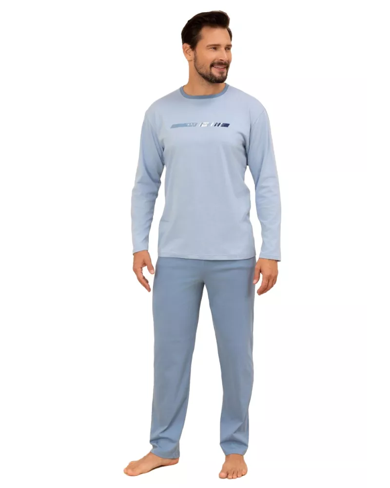 Pánské pyžamo 494/51 značky REGINA představuje spojení elegance a pohodlí, které si zamilujete při každém večerním odpočinku. Jemný odstín světle modré v kombinaci s decentním obrázkem na hrudi vytváří nadčasový vzhled, který nikdy neomrzí. Díky volnému střihu a příjemné bavlně se budete cítit maximálně uvolněně – ať už trávíte klidný večer doma nebo si dopřáváte kvalitní spánek. Dlouhé kalhoty s elastickým pasem poskytují dokonalou volnost pohybu i během chladnějších nocí. Kulatý výstřih působí moderně a zároveň je velmi praktický pro každodenní nošení.