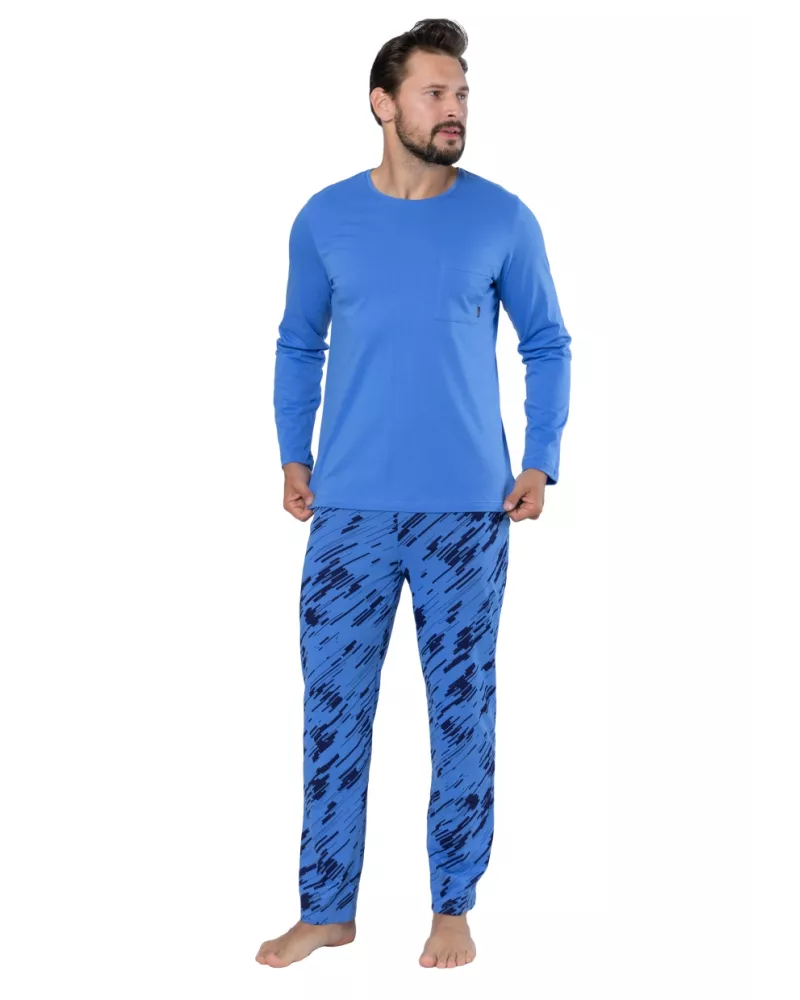 Pánské pyžamo Egon 1685/51 značky HOTBERG přináší spojení elegantního vzhledu a pohodlí, které ocení každý muž. Vrchní díl v sytě modré barvě působí svěže, zatímco dlouhé kalhoty s abstraktním vzorem v odstínech modré a černé dodávají moderní šmrnc. Lehký materiál ze 100% bavlny zajišťuje příjemný pocit na těle i dostatečnou prodyšnost během spánku nebo odpočinku doma. Kulatý výstřih a volnější střih poskytují maximální komfort bez omezení pohybu, což je ideální pro každodenní nošení i relaxaci.