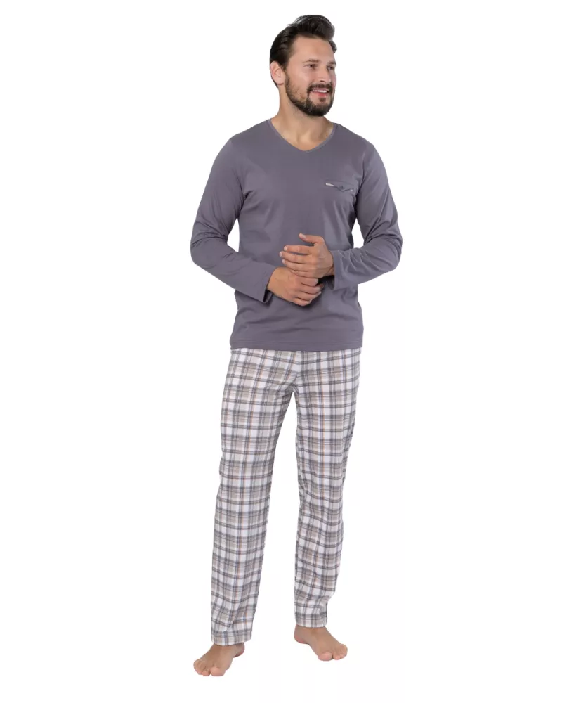 Pánské pyžamo Andrzej 1694/51 značky HOTBERG přináší spojení elegantního vzhledu a pohodlí, které si zaslouží každý moderní muž. Vrchní díl v decentní šedé barvě s výstřihem do V působí nenuceně stylově a zajišťuje maximální komfort během odpočinku i spánku. Spodní část tvoří dlouhé kalhoty s klasickým kostkovaným vzorem v odstínech šedé, bílé a jemných akcentů, které dodávají celému kompletu osobitý charakter. Měkký materiál ze 100% bavlny je příjemný na dotek, prodyšný a vhodný i pro citlivou pokožku – pocit lehkosti Vás bude provázet po celý večer.