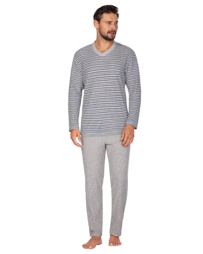 Pánské froté pyžamo 450/32 značky REGINA představuje ideální volbu pro muže, kteří hledají spojení pohodlí a elegantního vzhledu při domácím odpočinku. Vrchní díl s výstřihem do V vyniká decentním proužkovaným vzorem na jemném froté materiálu, který příjemně hřeje a zároveň zajišťuje dostatečnou prodyšnost. Dlouhé kalhoty ve světle šedém odstínu doplňují celkový vzhled jednoduchostí i praktičností – rovný střih poskytuje maximální volnost pohybu a komfort po celý večer i noc. Díky kvalitnímu složení ze 100% bavlněného froté si můžete být jisti nejen měkkostí na dotek, ale také dlouhou životností tohoto pyžama.