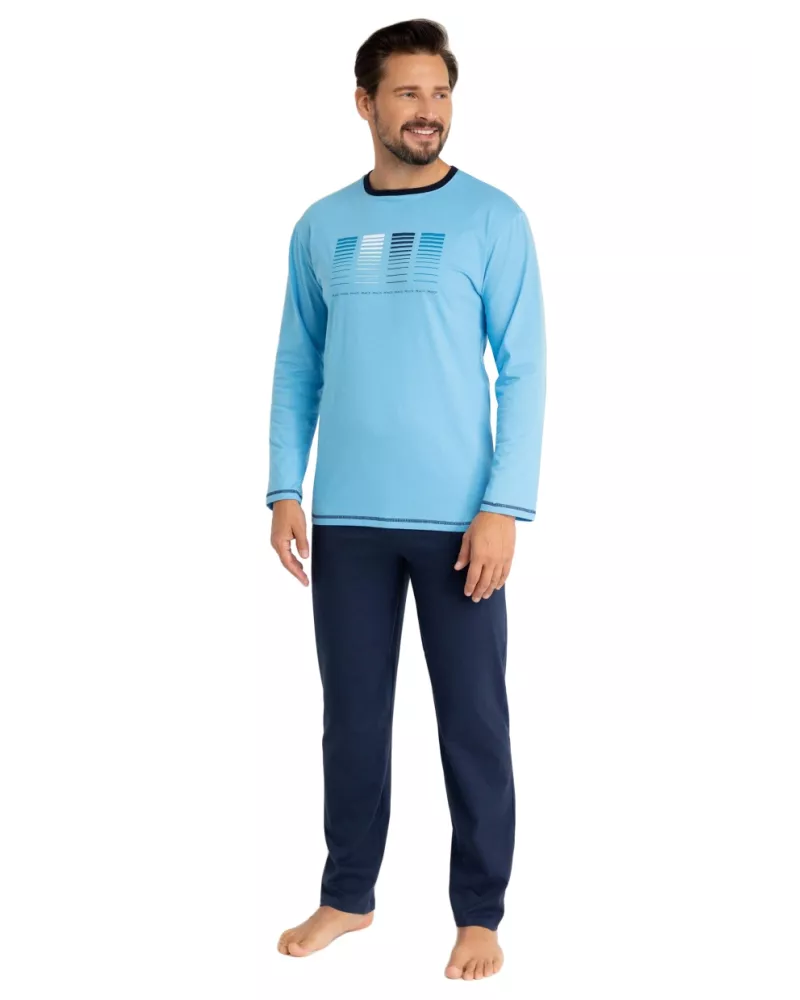 Pánské pyžamo 487/51 značky REGINA představuje spojení elegance a pohodlí, které ocení každý muž hledající kvalitní noční prádlo. Svěží světle modrý vršek s originálním potiskem vodorovných linií v odstínech modré a bílé dodává moderní vzhled, zatímco kontrastní tmavě modré lemy u krku i na rukávech podtrhují jeho stylový charakter. Dlouhé rukávy poskytují příjemné teplo během chladnějších nocí. Kalhoty v klasické tmavě modré barvě mají volný střih a elastický pas pro maximální komfort při spánku i domácím odpočinku. Celý komplet je vyroben ze 100% bavlny, která zaručuje měkkost na dotek, prodyšnost a dlouhou životnost.