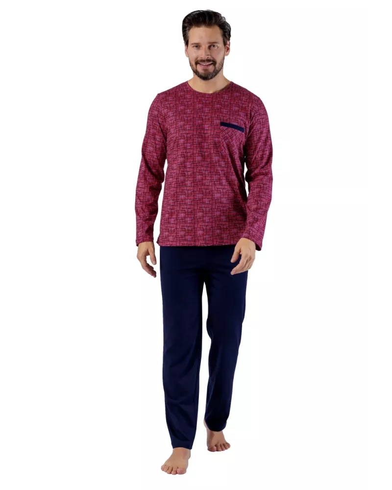 Pánské pyžamo Roman 1600 značky HOTBERG představuje spojení elegantního vzhledu a pohodlí, které ocení každý muž hledající kvalitní domácí oblečení. Vrchní díl ve vínové barvě se vzorovanou strukturou působí svěže a moderně, zatímco kontrastní náprsní kapsa v tmavě modré barvě dodává celku stylový akcent. Dlouhé rukávy spolu s kulatým výstřihem zajišťují příjemné teplo i během chladnějších nocí.