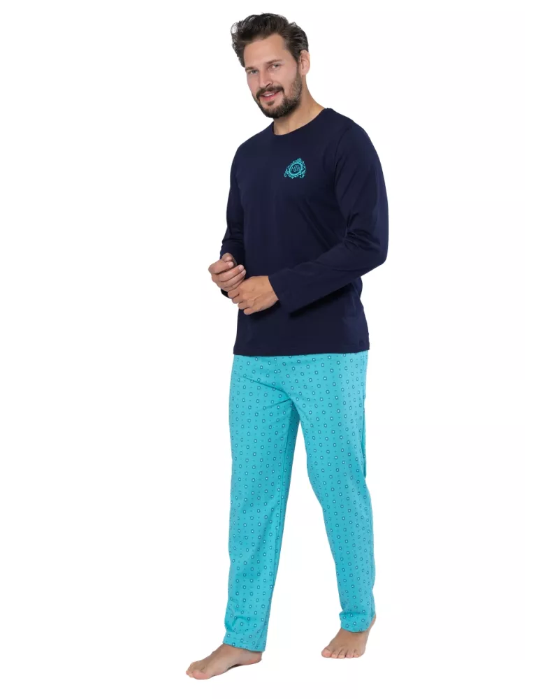 Pánské pyžamo Gawel 1689 značky HOTBERG přináší dokonalou kombinaci elegance a pohodlí pro Váš večerní odpočinek. Horní díl v tmavě modré barvě s kulatým výstřihem působí decentně, zatímco jemná výšivka na hrudi dodává osobitý detail. Kalhoty v tyrkysovém odstínu s geometrickým vzorem vytvářejí svěží kontrast a zároveň zůstávají nenápadné i stylové. Volný střih kalhot poskytuje maximální komfort při spánku i domácím lenošení.