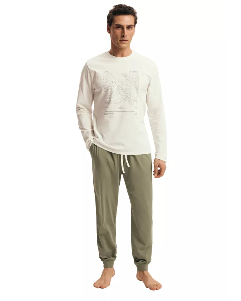 Pánské pyžamo Local 43464/01 značky HENDERSON představuje spojení elegantního stylu a pohodlí, které ocení každý muž. Horní díl ve světlé krémové barvě s decentním obrázkem působí svěže a nenuceně, zatímco olivově zelené kalhoty s pružným pasem a stahovací šňůrkou zajišťují maximální komfort při nošení. Pyžamo je vyrobeno ze 100% bavlny, což garantuje měkkost na dotek i prodyšnost během celého dne i noci. Volnější střih umožňuje volný pohyb bez omezení, ideální jak pro domácí relaxaci, tak klidný spánek.