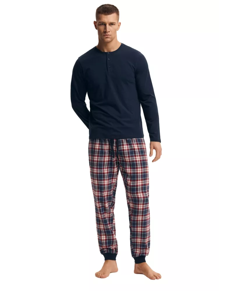Pánské pyžamo Noir 43457/59 značky HENDERSON představuje ideální volbu pro muže, kteří hledají spojení elegance a pohodlí. Horní díl s dlouhým rukávem v námořnické modři zaujme klasickým henley střihem s kulatým výstřihem a třemi knoflíky, což podtrhuje decentní styl i praktičnost. Spodní část tvoří dlouhé kalhoty s elastickým pasem a ikonickým kostkovaným vzorem v tónech červené, bílé a modré – perfektní kontrast k jednobarevnému vršku. Celý komplet je vyroben ze 100% bavlny, která je příjemná na dotek, prodyšná a zajistí Vám maximální komfort během spánku i domácího odpočinku.