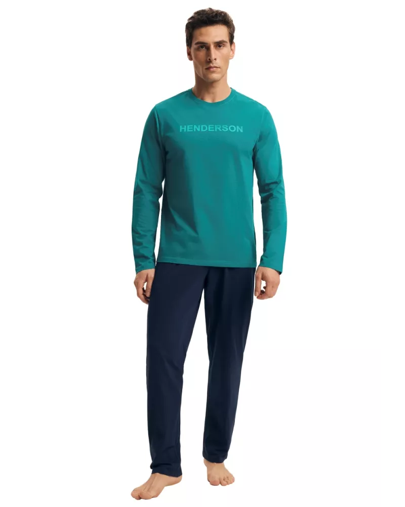 Pánské pyžamo Vise 43490 značky HENDERSON představuje dokonalou kombinaci pohodlí a stylu pro moderního muže. Horní díl v tyrkysové barvě s dlouhým rukávem a kulatým výstřihem působí svěže a elegantně, zatímco decentní potisk „HENDERSON“ na hrudi dodává moderní nádech. Spodní část tvoří volné tmavě modré kalhoty se strečovým pasem, které zaručí maximální komfort při každém pohybu. Celý komplet je vyroben ze 100% bavlny – materiálu příjemného na dotek i k pokožce, který dýchá a poskytuje pocit lehkosti po celý den.