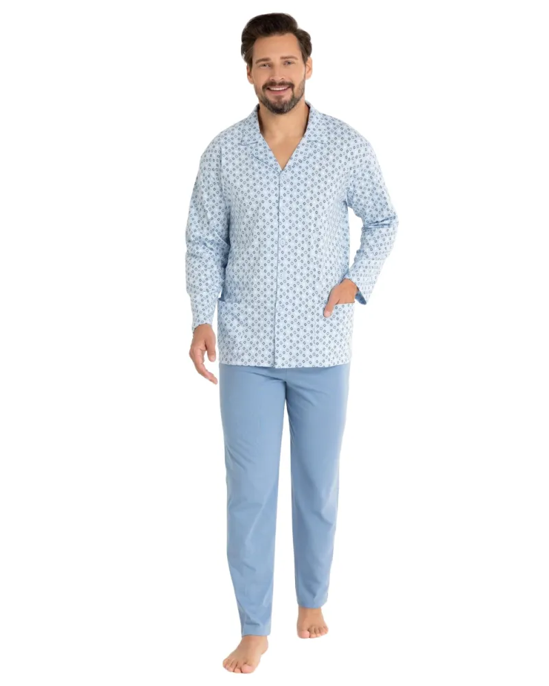 Pánské pyžamo 486/52 značky REGINA představuje spojení elegantního vzhledu a pohodlí, které ocení každý muž. Pyžamo s dlouhým rukávem je ušité z lehké bavlny, která příjemně dýchá a poskytuje maximální komfort během spánku i odpočinku. Světlý modrý odstín doplňuje decentní vzor, jenž dodává pyžamu osobitost bez zbytečné okázalosti. Klasický límec a praktické kapsy na bocích podtrhují funkčnost modelu, zatímco propínací provedení usnadňuje oblékání i svlékání. Kalhoty v ladícím tónu mají elastický pas pro volnost pohybu a pohodlí po celou noc.