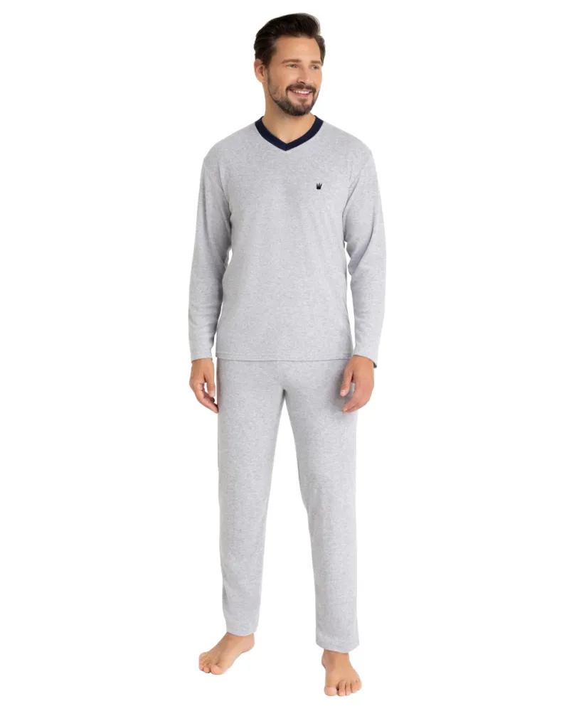 Pánské froté pyžamo 489/51 značky REGINA představuje ideální volbu pro muže, kteří si potrpí na pohodlí a styl i během odpočinku. Díky měkkému froté materiálu s vysokým podílem bavlny Vás čeká příjemný pocit lehkosti při každém doteku. Vrchní díl v decentní světle šedé barvě je doplněn kontrastním véčkovým výstřihem v námořnické modři, což dodává celku moderní vzhled bez zbytečných vzorů. Dlouhé kalhoty ve stejném odstínu zajišťují maximální komfort a svobodu pohybu po celý večer i noc. Elastický pas se přizpůsobí Vašim potřebám, zatímco kvalitní složení slibuje dlouhou životnost a snadnou údržbu.