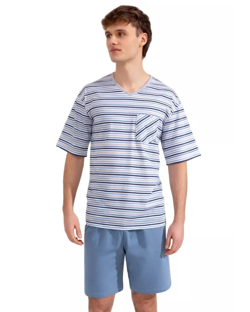 Pánské pyžamo 496/51 značky REGINA představuje spojení nadčasové elegance a maximálního pohodlí. Vzdušný střih s krátkými kalhotami a stylovým proužkovaným vzorem vytváří uvolněný dojem, který oceníte při každém večeru i víkendovém lenošení. Kvalitní 100% bavlna zajišťuje příjemný pocit na pokožce, lehkost a prodyšnost v teplých měsících. Výrazným prvkem je moderní výstřih do V, jenž podtrhuje ležérní vzhled pyžama. Malá náprsní kapsa přidává decentní detail i praktickou funkci.