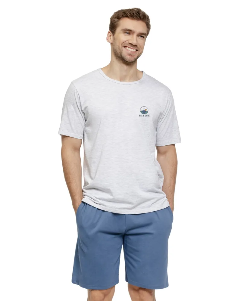 Pánské pyžamo Gabriel 3576/3577/62 značky TARO přináší spojení elegance a pohodlí, které ocení každý muž. Lehký šedý top s decentním obrázkem na hrudi působí svěže a vkusně, zatímco krátké kalhoty v modré barvě zajišťují maximální komfort během teplých nocí i odpočinkových večerů. Pyžamo je vyrobeno ze 100% bavlny, což znamená příjemný pocit na pokožce a optimální prodyšnost po celou noc. Kulatý výstřih podtrhuje jednoduchost střihu i snadné oblékání.