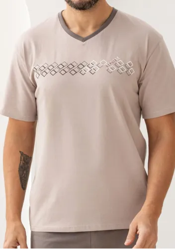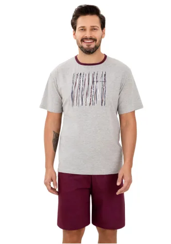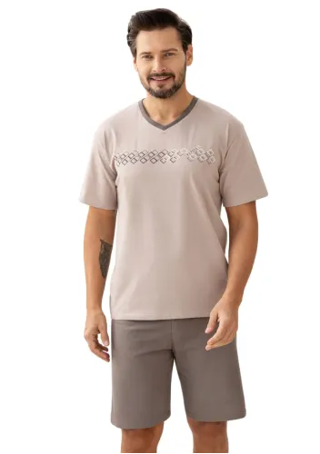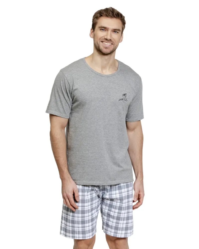 Pánské pyžamo Eliot 3583 TARO je ideální volbou pro muže, kteří ocení pohodlí a styl v jednom. Světlé tričko s krátkým rukávem a decentním motivem na hrudi působí elegantně, zatímco kostkované krátké kalhoty v odstínech šedé dodávají outfitu moderní vzhled. Díky elastickému pasu se krátké kalhoty dokonale přizpůsobí postavě a zajišťují maximální komfort při nošení i během letních nocí. Měkký materiál ze 100% bavlny nabízí příjemný pocit na pokožce, skvělou prodyšnost i snadnou údržbu.