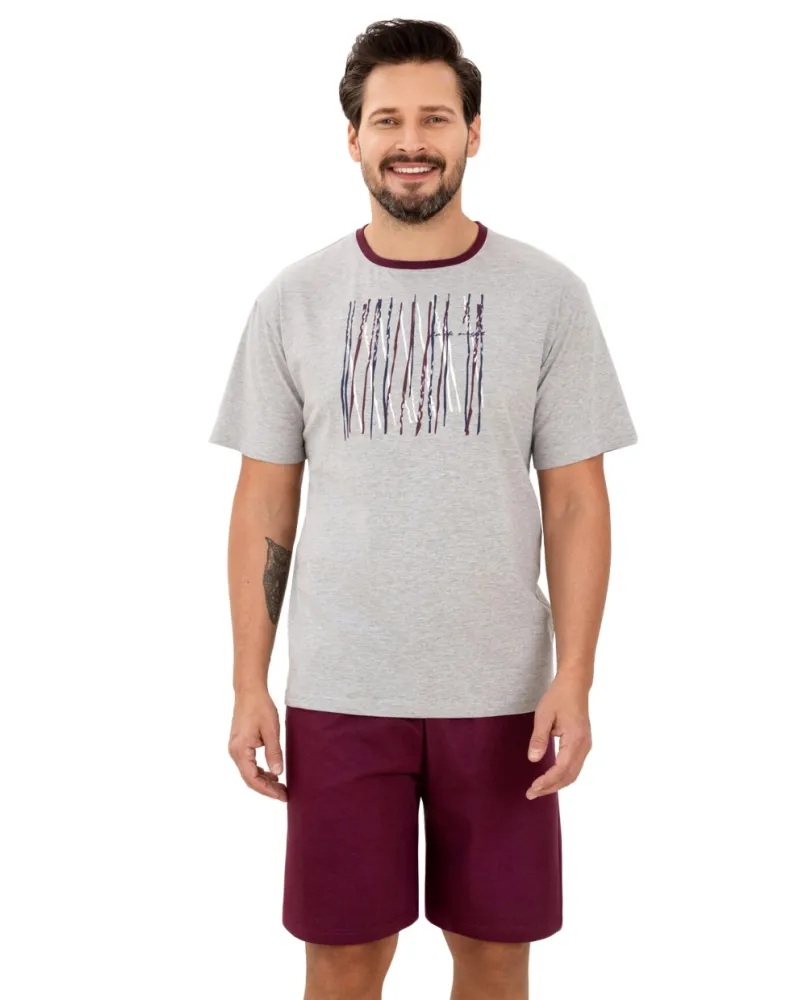 Pánské pyžamo 500/63 značky REGINA představuje ideální volbu pro muže, kteří si potrpí na pohodlí a styl i během odpočinku. Lehký šedý top s krátkým rukávem zaujme moderním grafickým motivem v podobě barevných linií, které dodávají outfitu svěží vzhled. Výrazný kontrast tmavšího lemování u krku podtrhuje elegantní charakter pyžama. Kraťasy v hlubokém vínovém odstínu skvěle ladí se světlejším vrškem a díky elastickému pasu poskytují maximální komfort při nošení i při domácí relaxaci. Měkká bavlna je příjemná na dotek, dobře odvádí vlhkost a umožňuje pokožce dýchat.