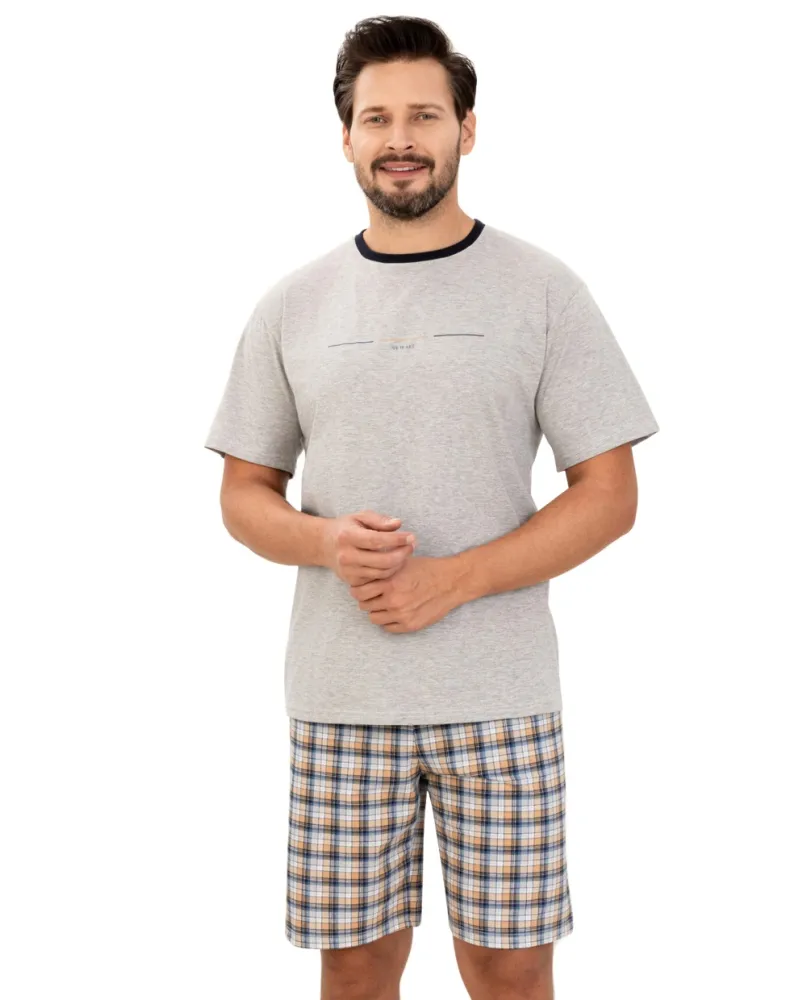 Pánské pyžamo 502/61 značky REGINA přináší spojení elegantního stylu a maximálního pohodlí pro každodenní relaxaci. Lehký šedý top s kontrastním tmavě modrým lemem u krku a decentním motivem na hrudi působí vkusně, aniž by byl příliš výrazný. Krátké kalhoty s moderním kostkovaným vzorem v tónech modré, oranžové a krémové dodávají celému kompletu svěží vzhled. Materiál ze 100% bavlny zajišťuje výjimečnou měkkost i prodyšnost – ideální volba do teplejších dnů nebo na pohodové domácí večery.