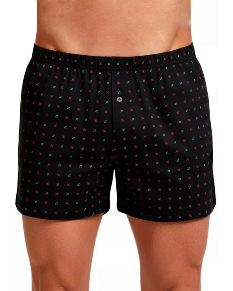 Pánské trenky BB008 černá značky NOVITI představují spojení elegantního vzhledu a maximálního pohodlí. S černým základem a výrazným geometrickým vzorem v kontrastních barvách působí svěže, ale zároveň decentně. Lehký materiál z čisté bavlny je příjemný na dotek, prodyšný a vhodný pro celodenní nošení i relaxaci doma. Volnější střih s delšími nohavičkami poskytuje volnost pohybu bez omezení, zatímco pružný pas se dokonale přizpůsobí Vašemu tělu a zajistí komfort bez otlaků či podráždění pokožky.