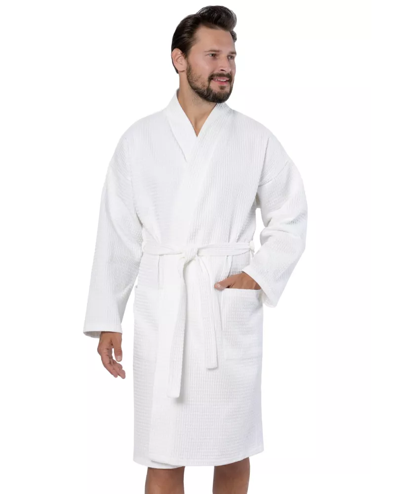 Materiál tvoří 100% bavlna, která je měkká na dotek, výborně saje vlhkost a umožňuje pokožce dýchat. Župan se zavazuje páskem pro individuální nastavení obvodu pasu; praktické kapsy na bocích poskytnou prostor pro drobnosti. Délka sahající ke kolenům spolu s širokými rukávy přináší pocit lehkosti i svobody.